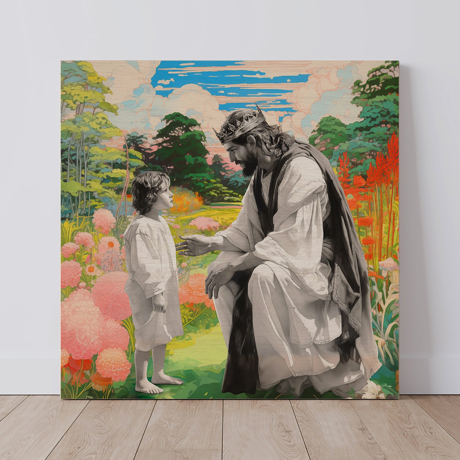 Introducing our Beautiful Wood Print of Jesus and the Boy in Eden, a heartwarming illustration that captures the innocence of a child and the divine serenity of our older brother and king in a lush, Eden-like setting. This artwork is not just a visual delight but a symbol of faith and hope, beautifully brought to life on premium wood.