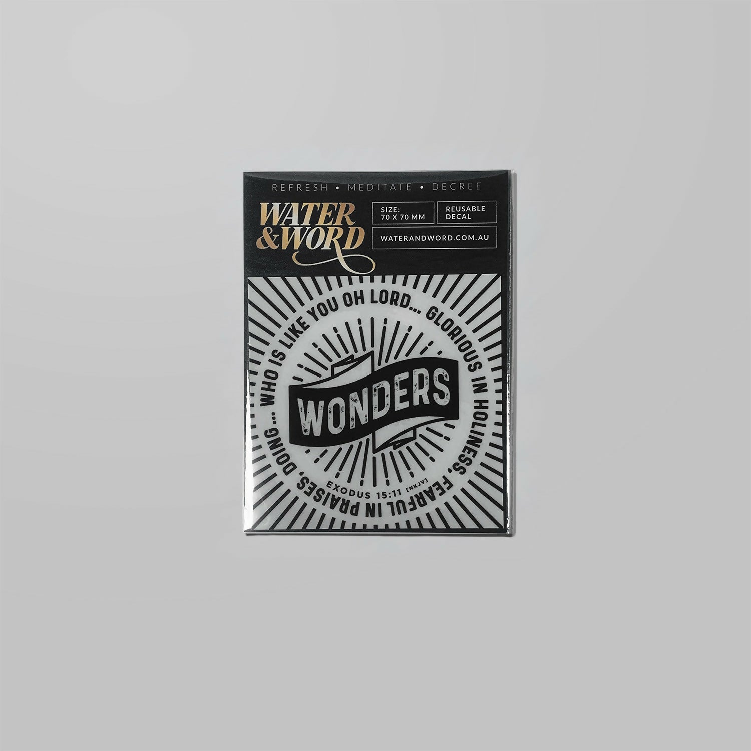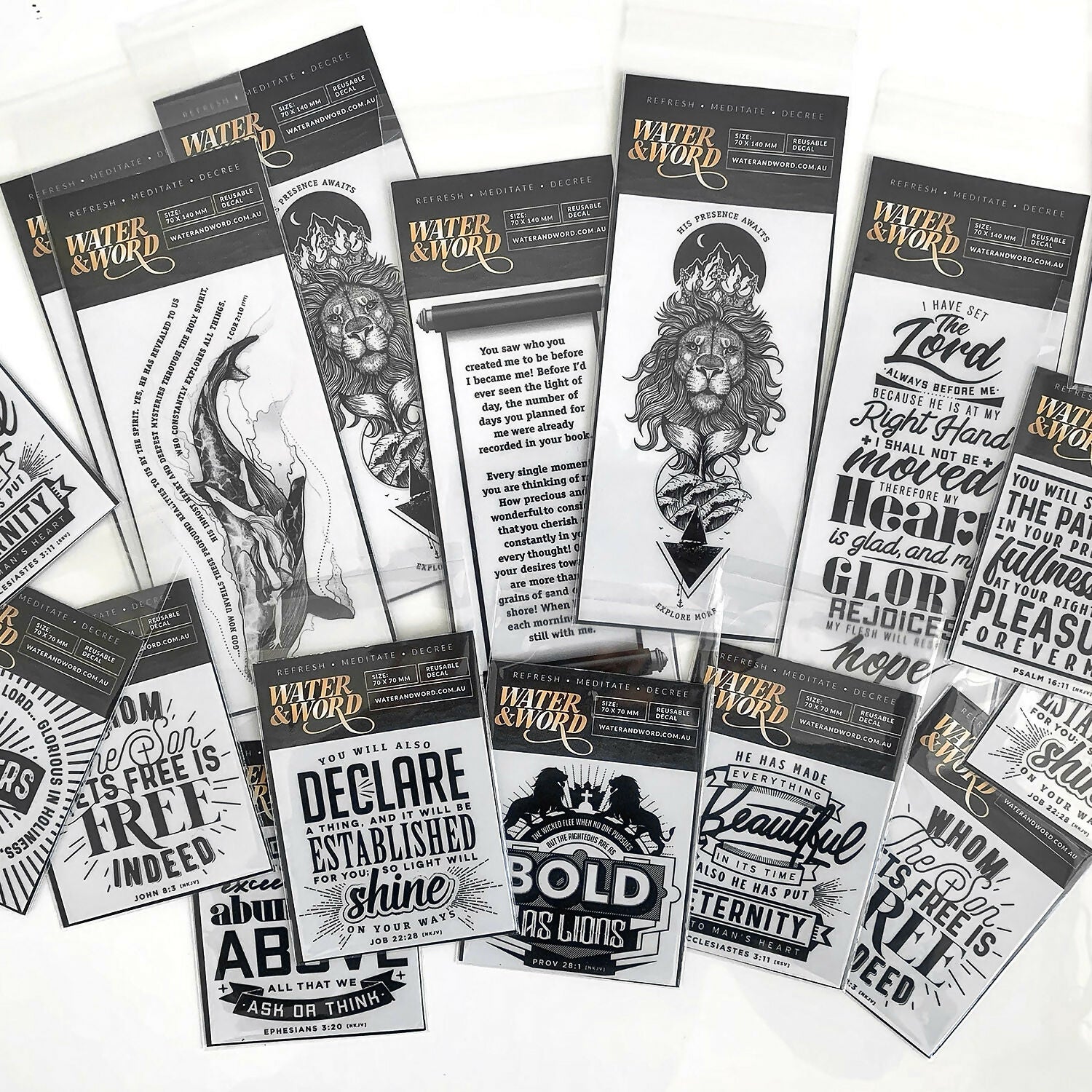 Water & Word decals are encounter-birthed and inspired prophetic illustrations, and typographic designs of Biblical Scriptures, that can be used and reused on any flat surface in your home as a removable ‘tattoo’ for walls and surfaces. Being free of adhesives it can easily be removed, repositioned and reused however you want. Think of it as a surface tattoo, without the decor commitment and with a reusability that will give you true value for money.