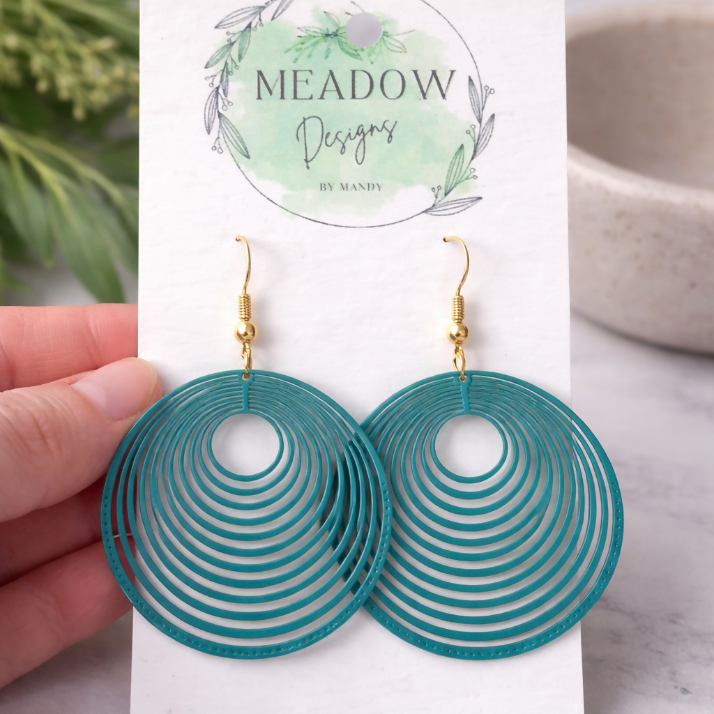 Delicate laser jet cut metal with gold plated dangles. Turquoise...the colour of the season!
